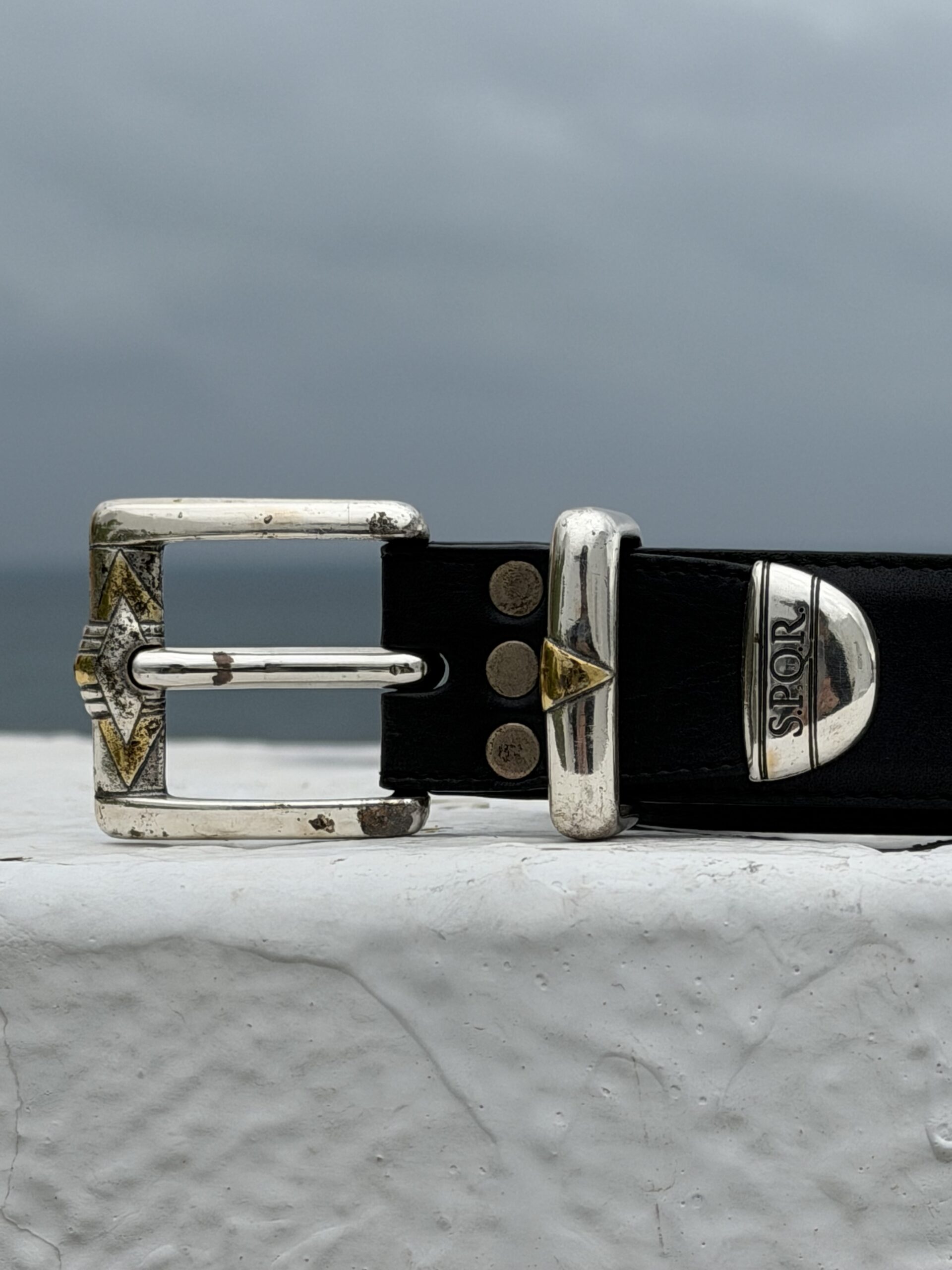Ceinture en cuir noir avec des empiècements motos argentées.