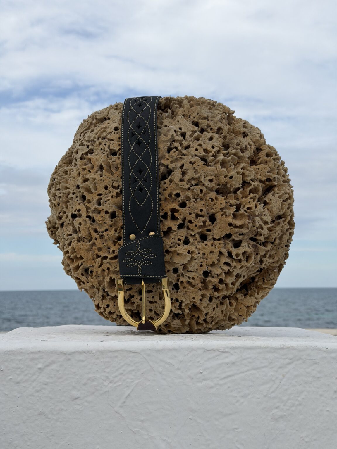 Ceinture en cuir noir avec des détails brodés et une boucle dorée .